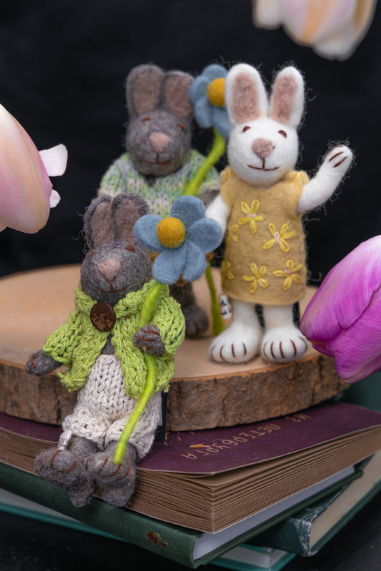 Handtovad Grå Kanin- Kille med blomma